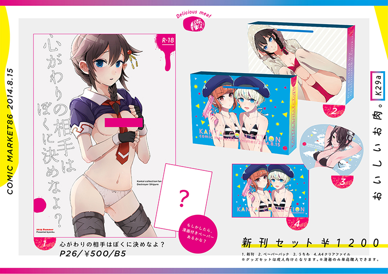 13 August C86 夏コミイベント情報 C86のお品書きができました〜。 今回初めて、ペーパーバッグとグッズセットをつくってみました・・・! まだ、ペーパー執筆中ですが、ぺら〜いのをつけられるかと思います・・・。 夏コミ新刊 今回は、ずっと描きたかった時雨のえっちな本にです〜。 表紙のぱんつ描くのがたのしかったです。 詳細サンプル とらのあなさんで、委託して頂いてます。 コミケこられない方は是非利用してみてくださいませ。 また、9月の砲雷でも配布予定です〜。 9月の砲雷は、島風天津風の新刊も考えてますので、 そちらもよろしくお願いします〜〜〜!なにとぞ! ・・・・・・・・・・・・・・・・・・・・・・・・・・・ ※今回、背面ポスターとは別に机前にポスターがあるのですが、 欲しい方は14時30分にサークル前に起こしください。 複数の場合はじゃんけんとなります。よろしくお願いします〜! ・・・・・・・・・・・・・・・・・・・・・・・・・・・ お肉。